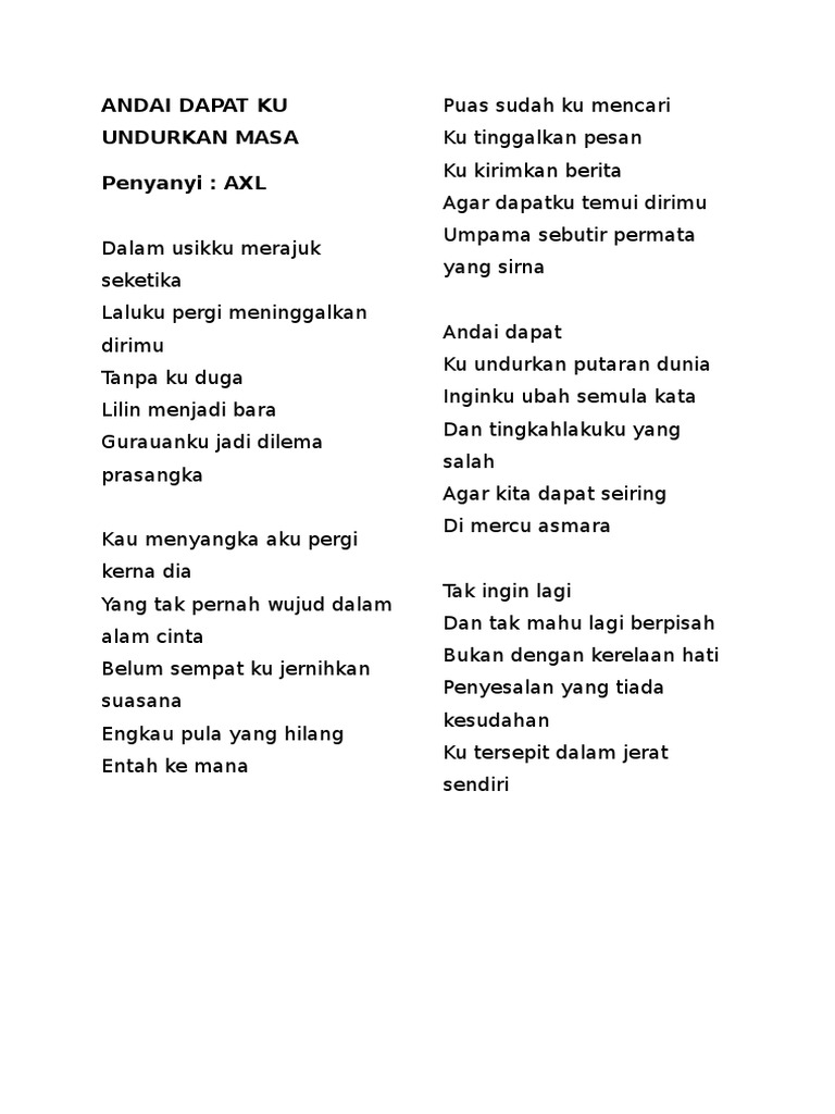 Lirik Lagu AXLs - Andai Dapat Ku Undurkan Masa By. Axl - Andai Dapat Ku Undurkan Masa Chord. Inginku ubah semula kata-kata dan tingkahlaku ku.