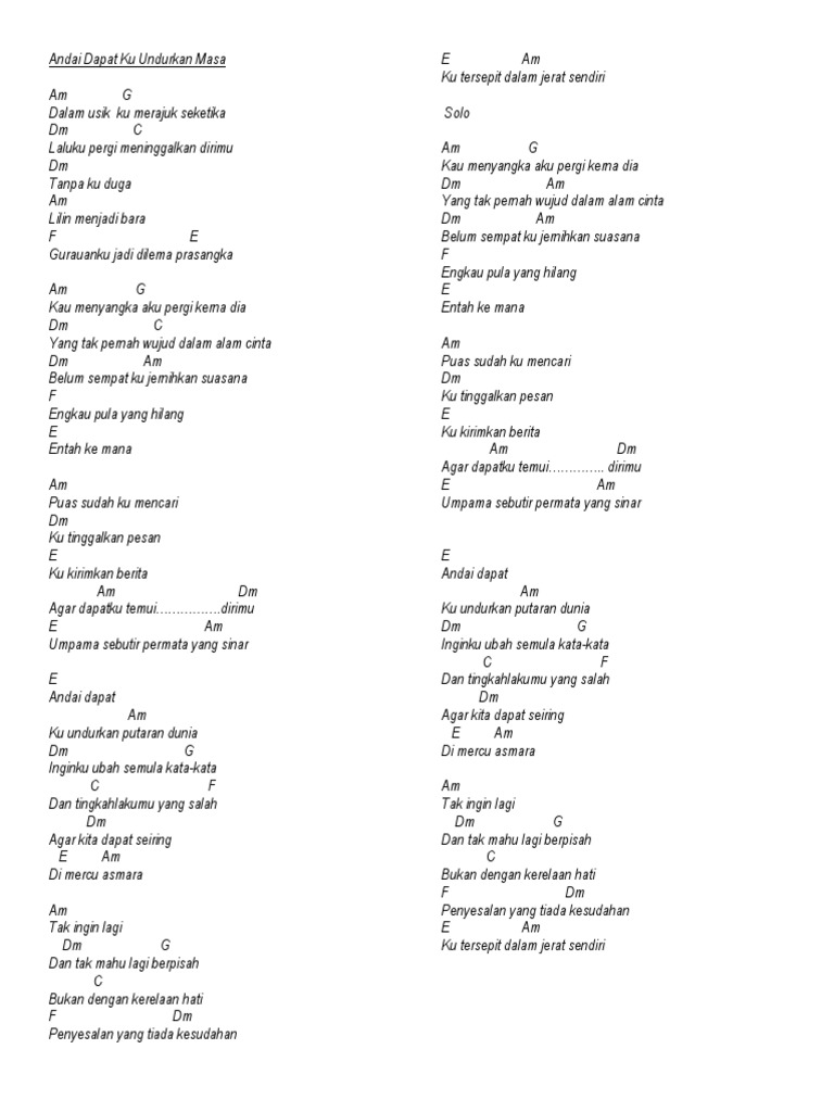 Am G Dalam usikku merajuk seketika Dm Am Laluku pergi meninggalkan dirimu Dm Tanpa ku duga Am Lilin menjadi bara F E Gurauanku jadi dilema prasangka Am G. Lirik Lagu Andai Dapatku Undurkan Masa Axls. Ku undurkan putaran dunia.